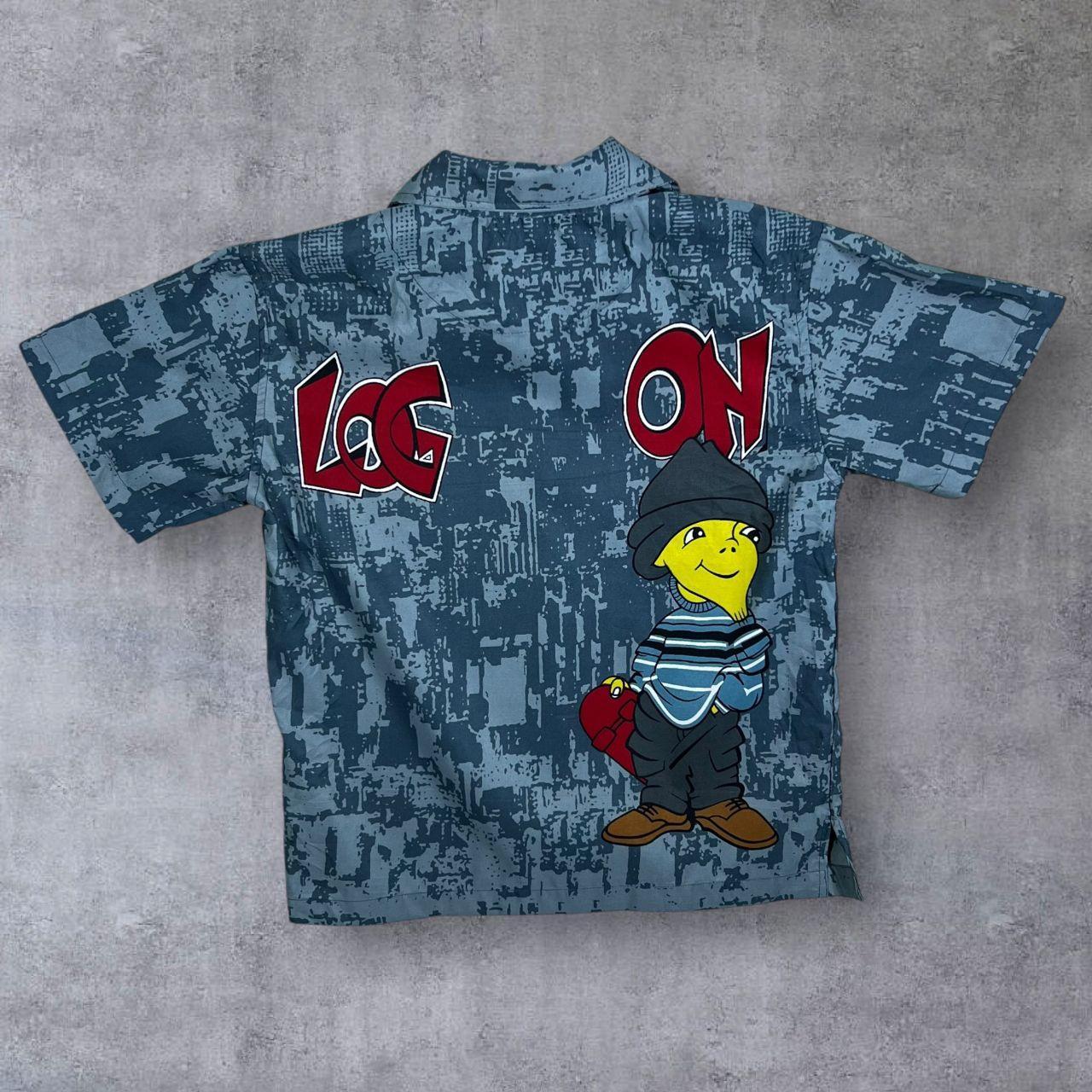 Early 00's Log On Hip Hop Y2K Patterned Grey Blue Short Sleeve Shirt