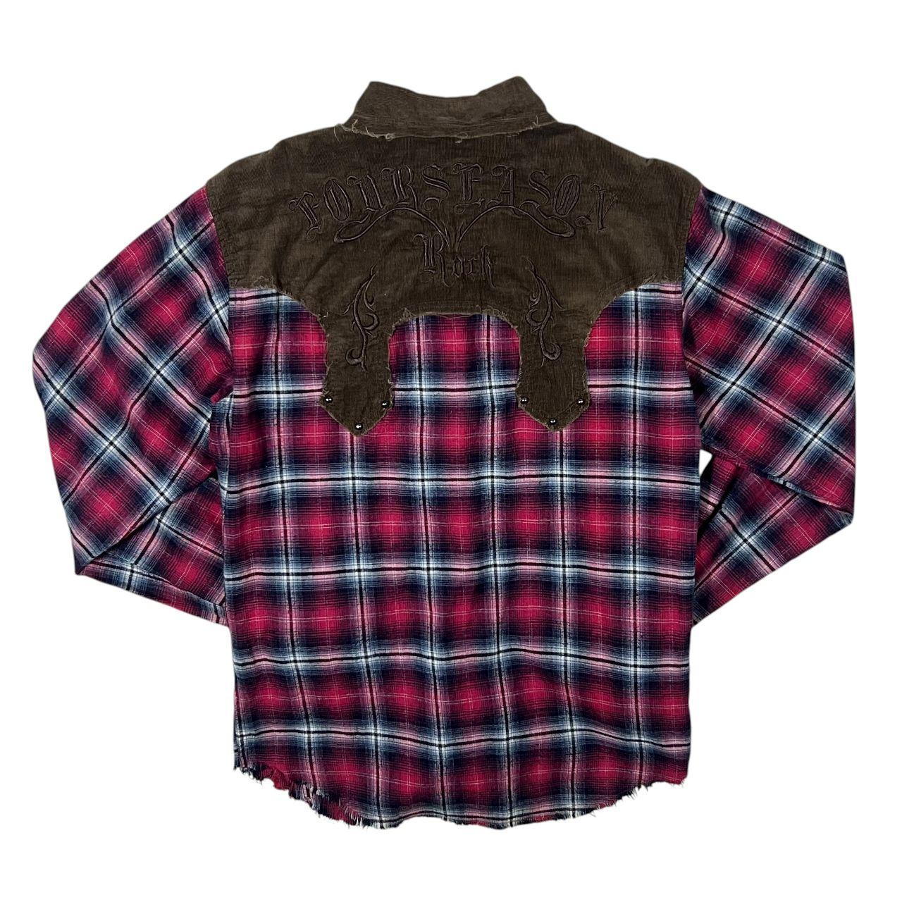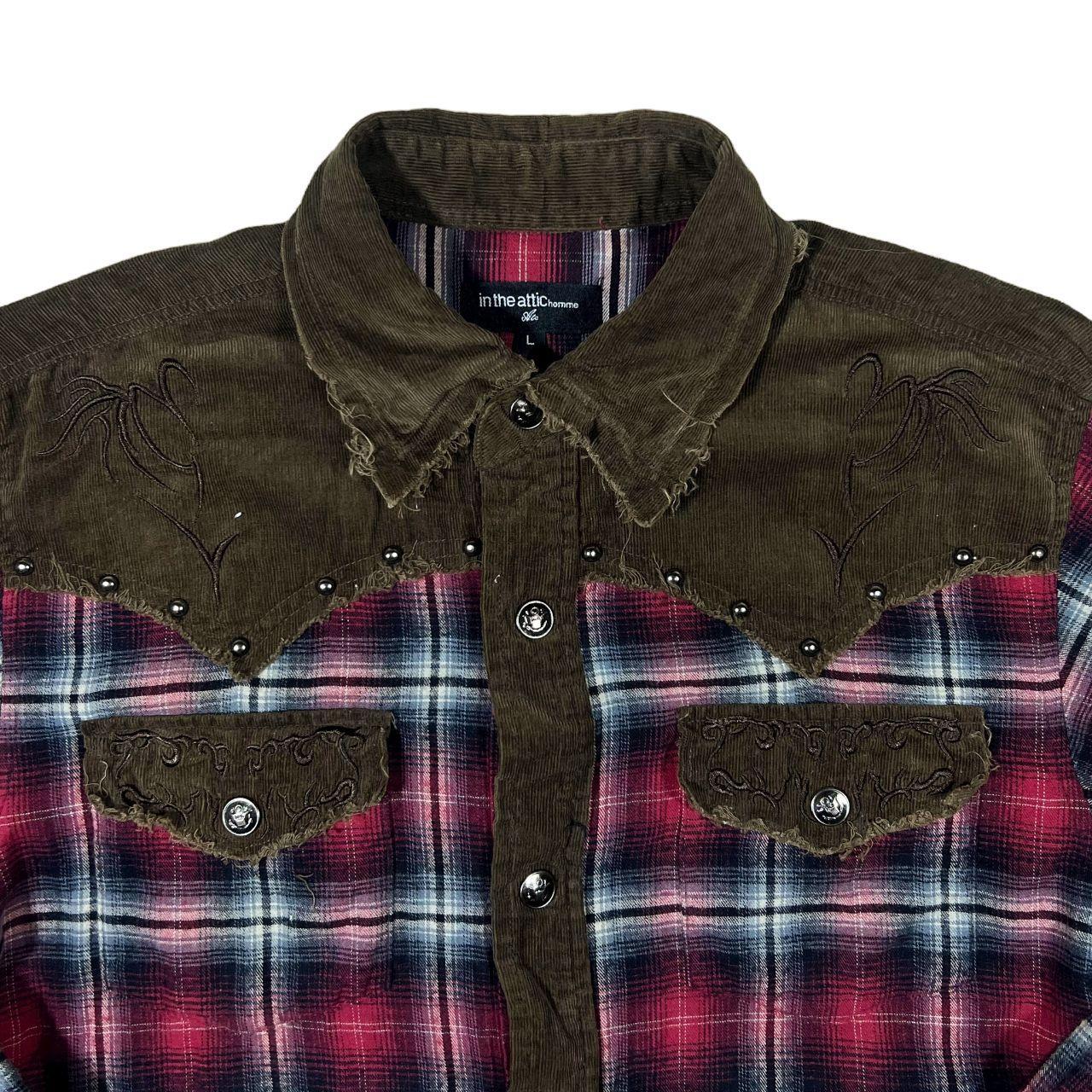 In The Attic Cowboy Western Style Plaid Check Corduroy Cord Panel Popper Long Sleeve Shirt