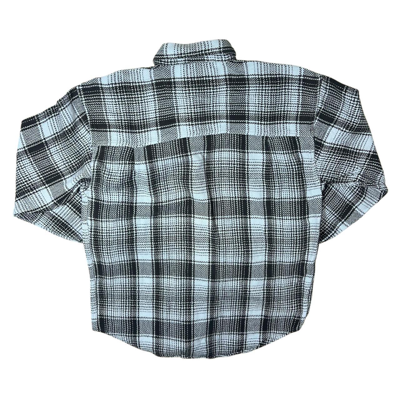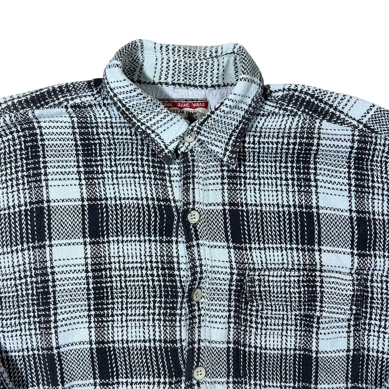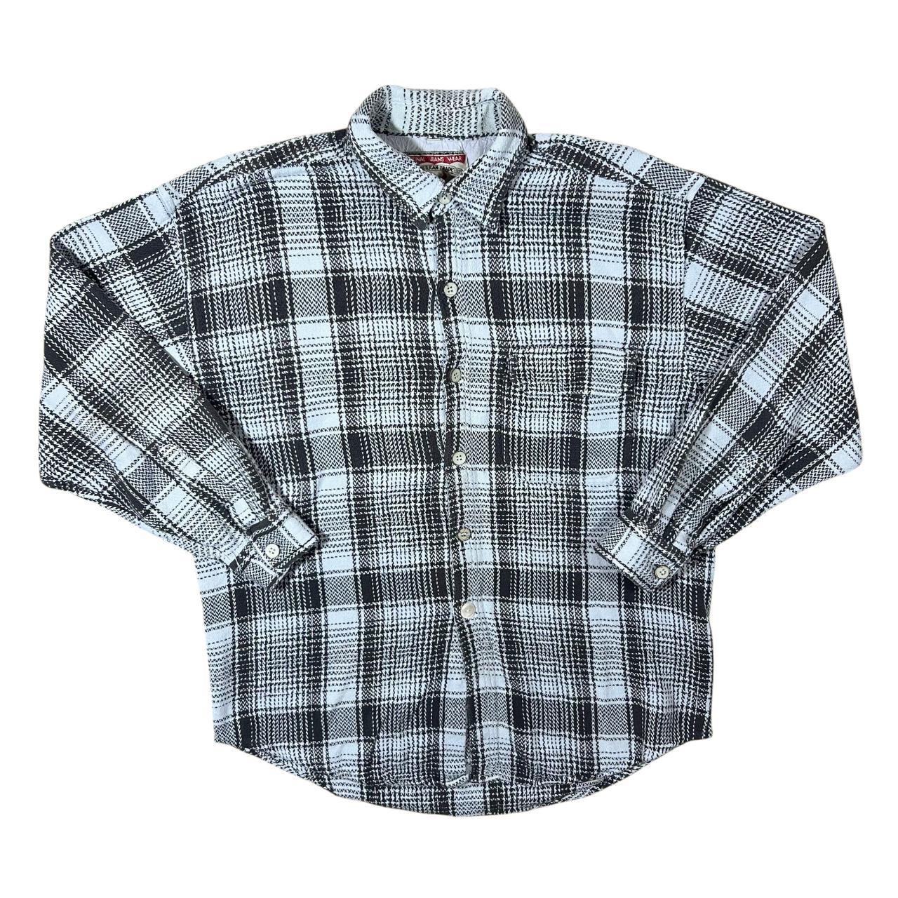 Vintage 90's American Trade Blue-Grey Black Check Long Sleeve Flannel ShirtSize: Large (See measurements)Colour: Grey-Blue/Black CheckDetail: 100% cotton materialCondition: Light general wear as expected.Measurements: Pit to Pit: 23”Length: 28.5”Shoulder to Cuff: 21"#OG127