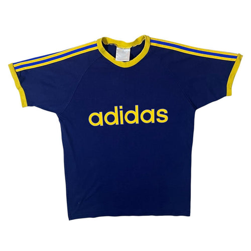 Vintage Adidas Big Spellout Graphic Three Stripe Blue Yellow Cotton Ringer T-Shirt