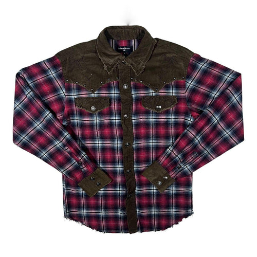 In The Attic Cowboy Western Style Plaid Check Corduroy Cord Panel Popper Long Sleeve Shirt