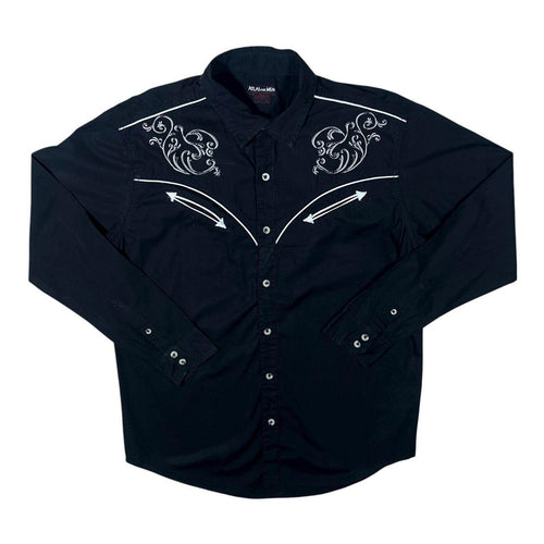 Vintage Embroidered Cowboy Western White Black Cotton Long Sleeve Shirt