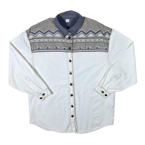 Vintage Casual Wear Aztec Cowboy Western White Blue Cotton Long Sleeve Shirt