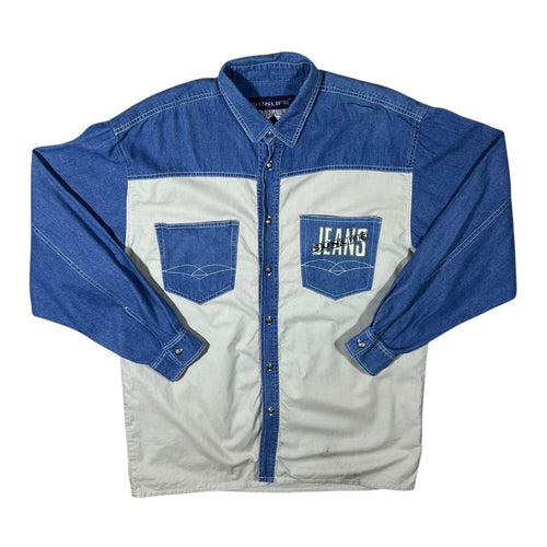 Vintage Sunlife Jeans Cowboy Western Style Blue Denim Beige Cotton Long Sleeve Shirt