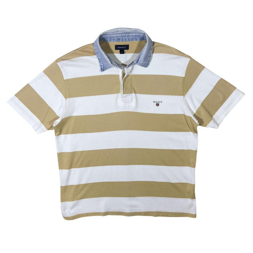 GANT Embroidered Mini Logo Denim Collared Beige White Striped Short Sleeve Polo Shirt