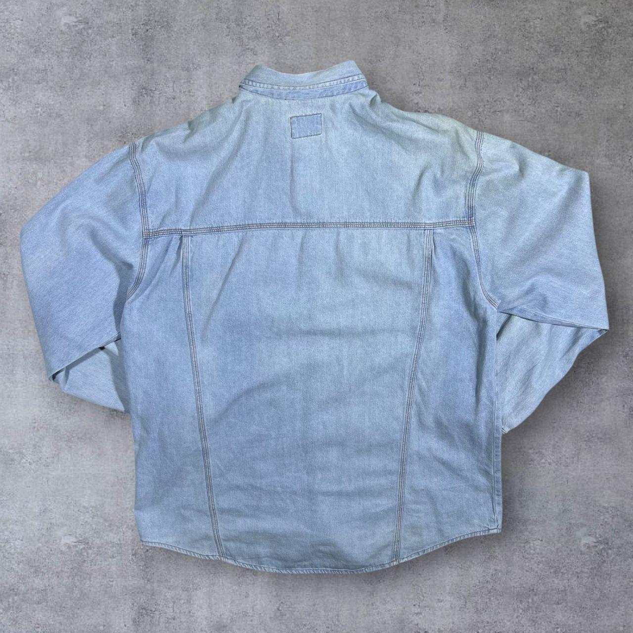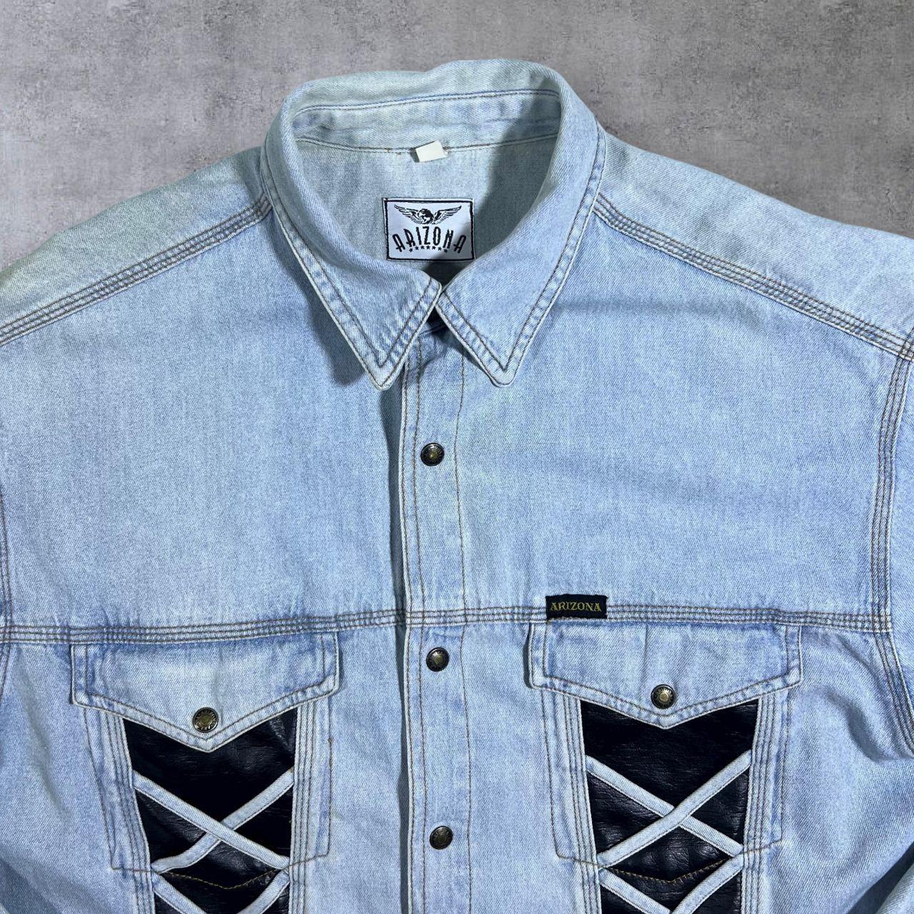 Vintage Arizona Cowboy Western Faded Blue Denim Lace Panel Popper Long Sleeve Shirt