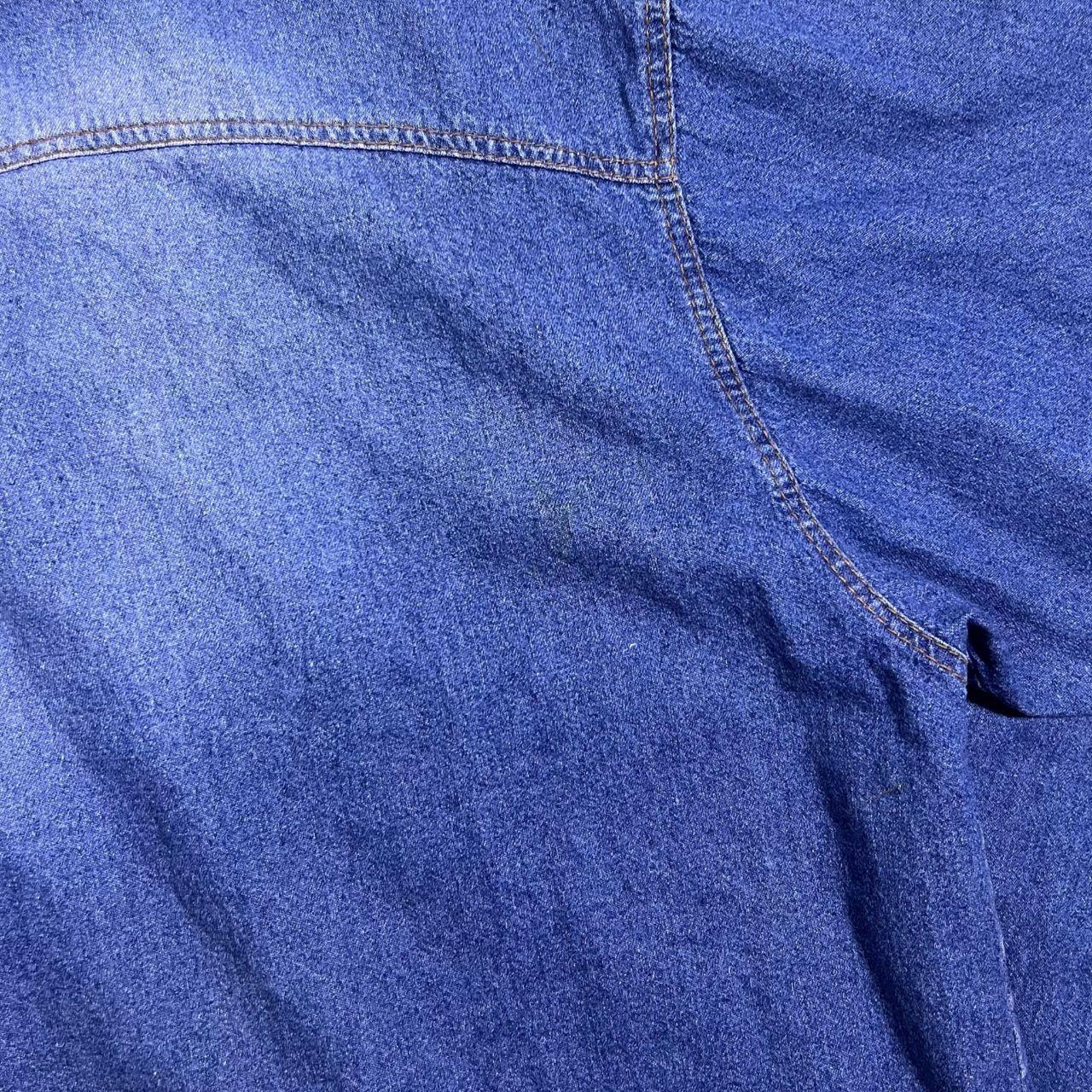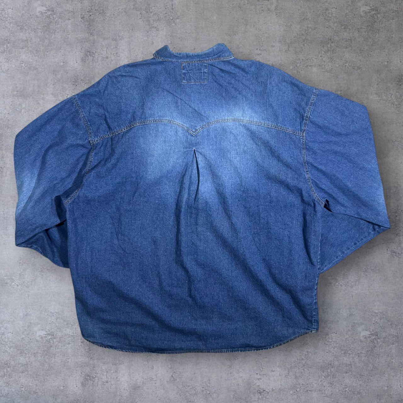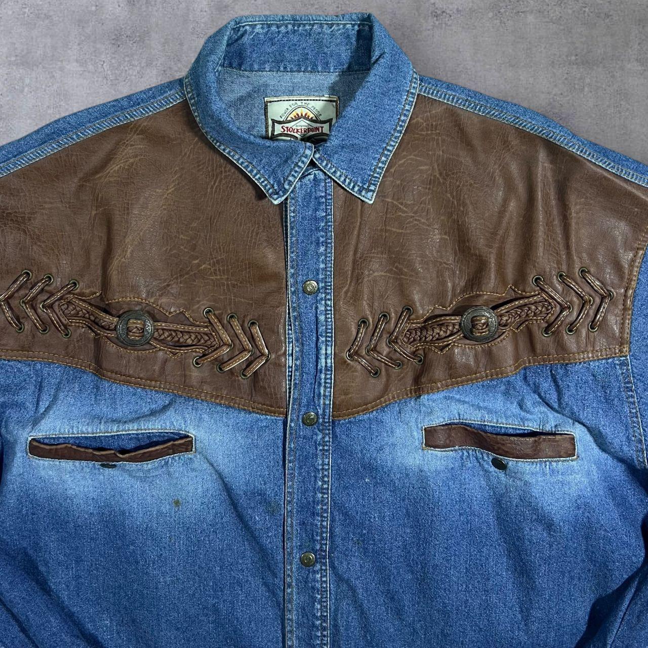 Vintage Stockerpoint Cowboy Western Blue Denim Brown Leather Panel Popper Long Sleeve Shirt