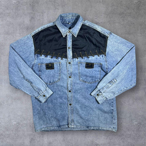 Vintage Cowboy Western Acid Wash Blue Denim Black Panel Popper Long Sleeve Shirt