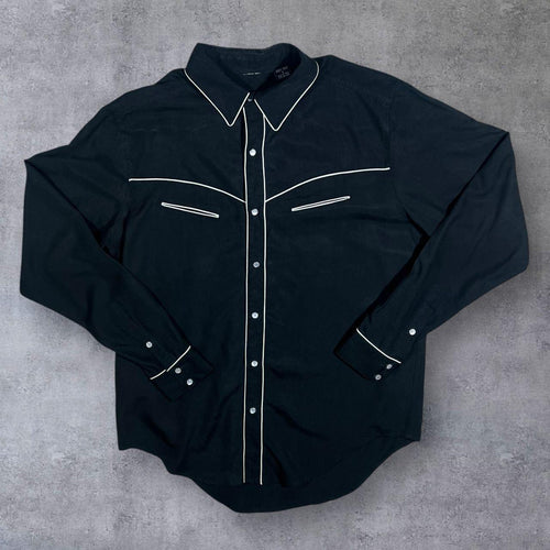 Vintage 100% Silk Cowboy Western Popper Button Black Long Sleeve Shirt
