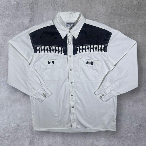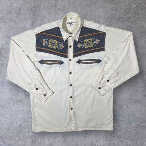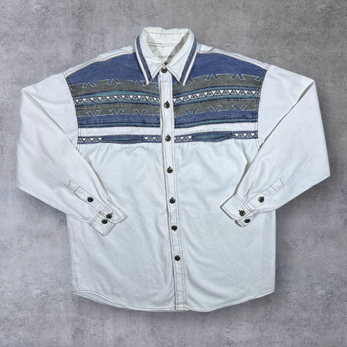 Vintage Forbidden Cowboy Western Aztec Patterned White Cotton Long Sleeve Shirt