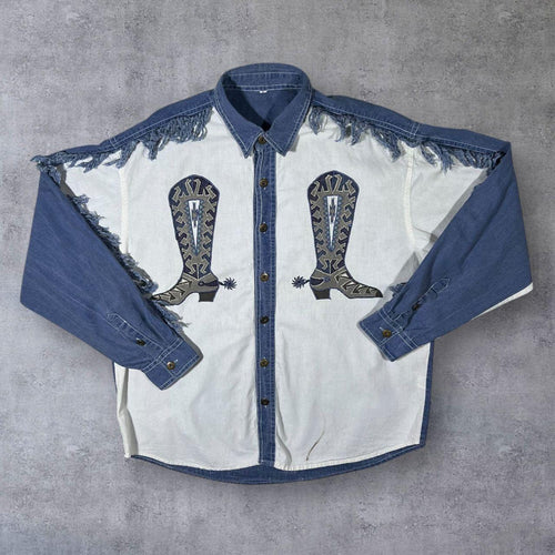 Vintage Embroidered Cowboy Boot Western Blue Denim Long Sleeve Cotton Shirt