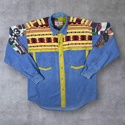 Vintage PCH Cowboy Western Corduroy Patterned Panel Blue Denim Long Sleeve Shirt
