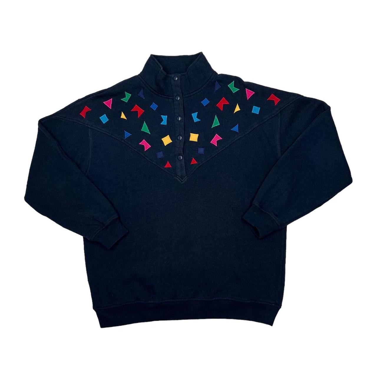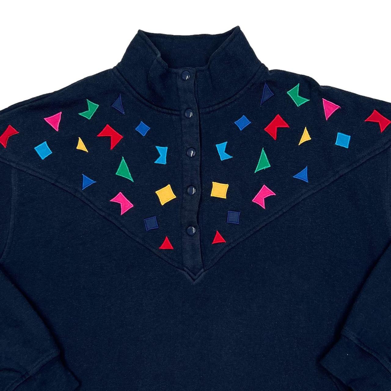 Size: Medium (See measurements) Colour: Navy Blue Detail: Embroidered abstract multi colour design to front Condition: Light general wear as expected with some light signs of overall bobbling