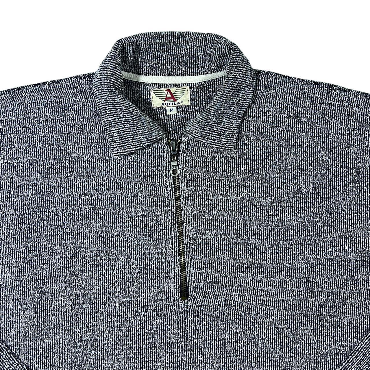 Vintage 90's Aquila Grey Black Navy Cotton 1/4 Zip Long Sleeve Pullover ShirtSize: Medium would fit Large/XL (See measurements)Colour: Grey-Black-Navy BlendDetail: 100% cotton materialCondition: Light general wear as expected.Measurements: Pit to Pit: 25”Length: 31”Shoulder to Cuff: 23"#OG126