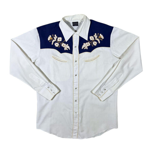 Vintage Cowboy Western Embroidered Floral Navy Blue White Long Sleeve Popper Shirt