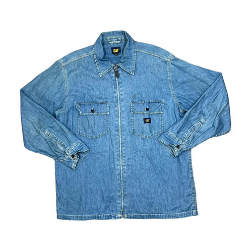 Early 00's CAT Caterpillar Mini Patch Logo Blue Denim Zip Over Shirt