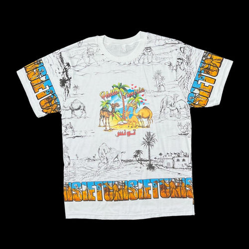 Early 00’s TUNISIA “Hello Tunisia” Souvenir Cartoon All-Over Print Spellout Graphic T-Shirt