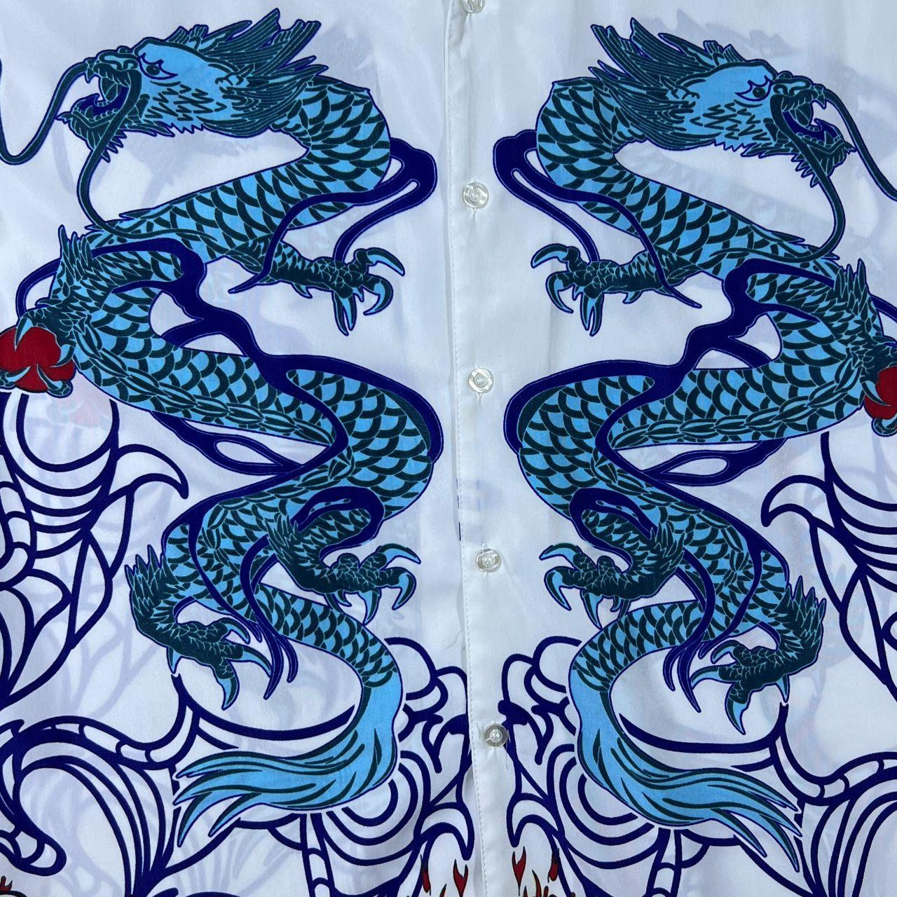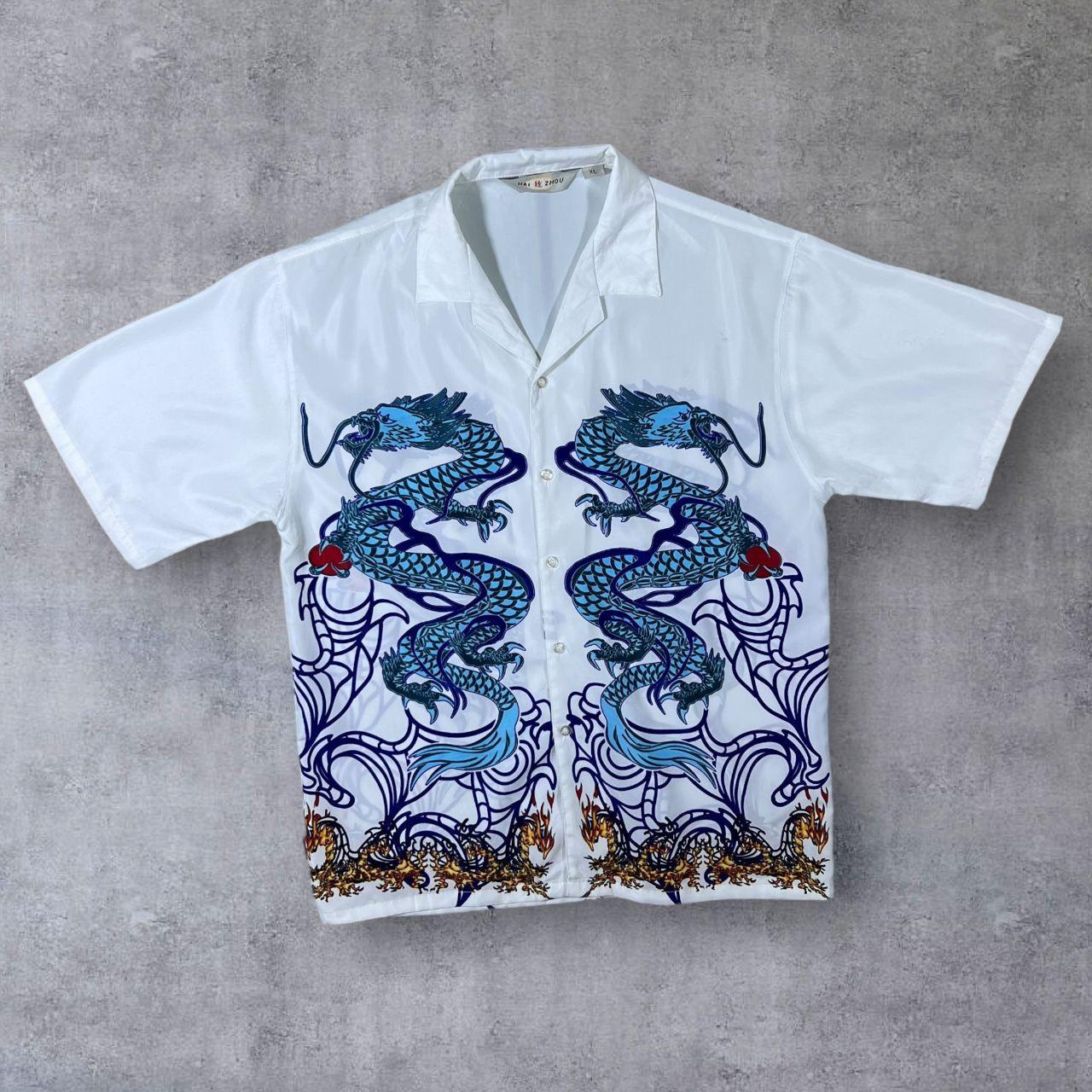 Early 00's Hai Zhou Goth Y2K Traditional Dragon Graphic Open Collar White Shirt
