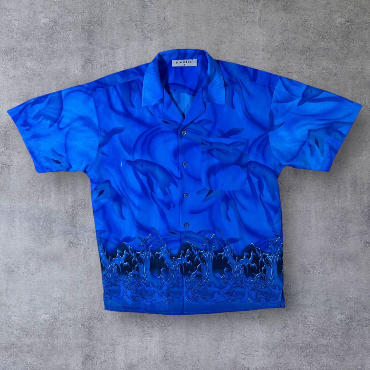 Early 00's Identic Y2K Surfer Dolphin Waves Ocean Graphic Blue Polyester Shirt