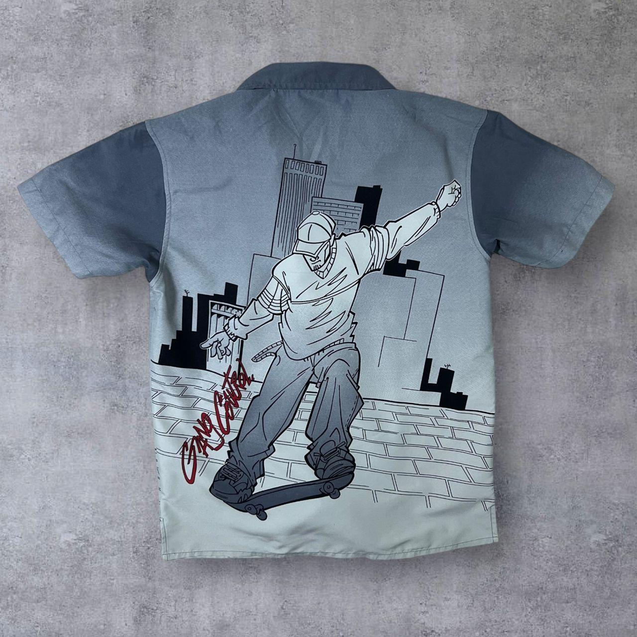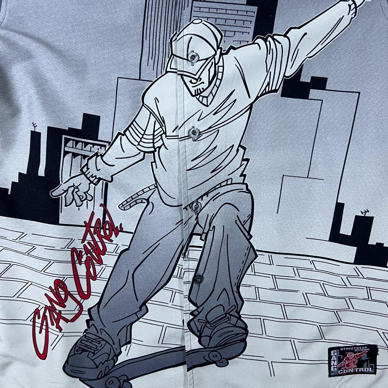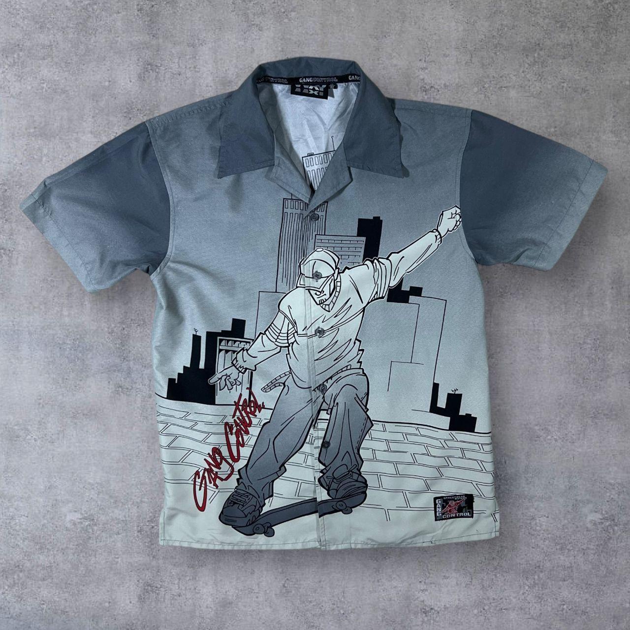 Early 00's WXY "Gang Control" Y2K Hip Hop Skater Graphic Grey Polyester Shirt