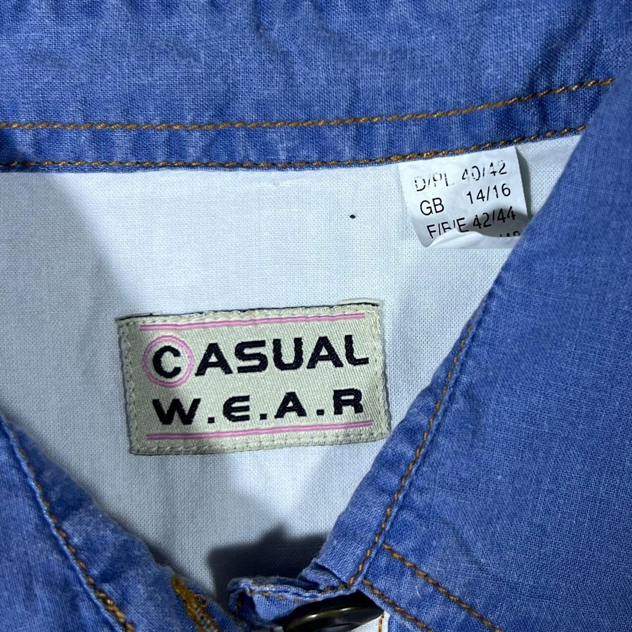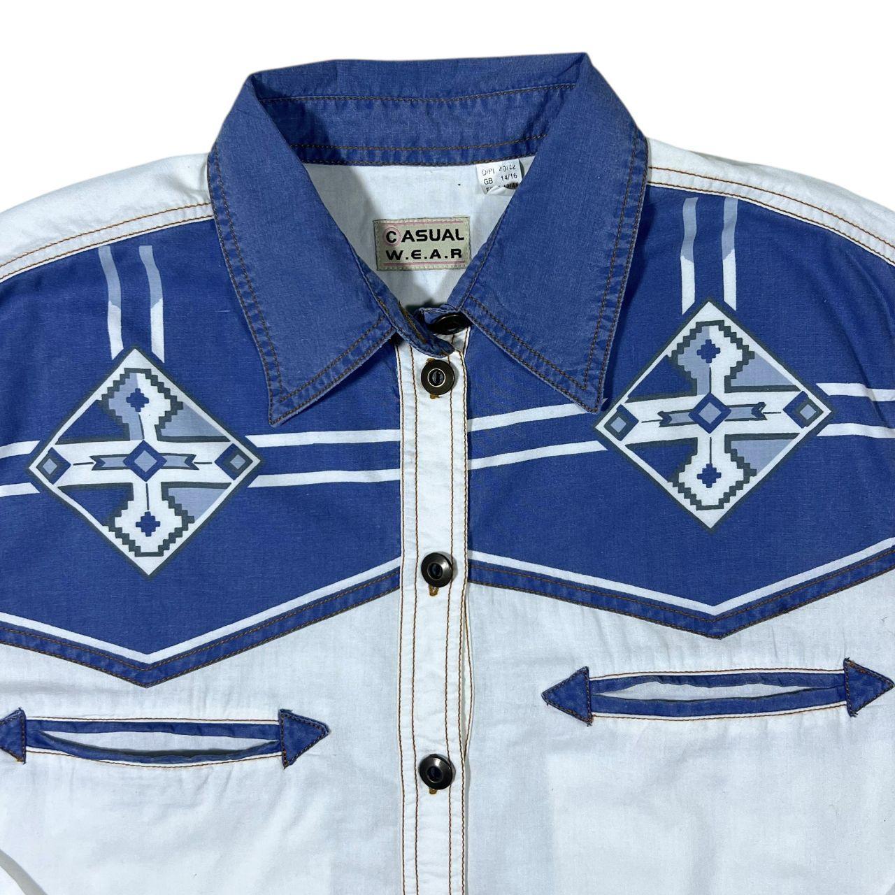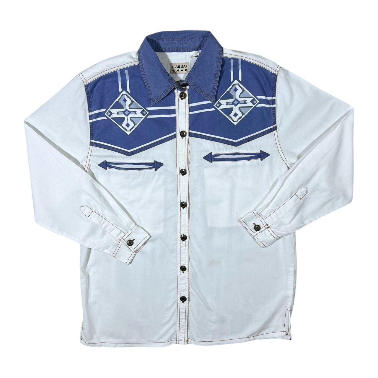Vintage Casual Wear Cowboy Western White Blue Cotton Long Sleeve Shirt
