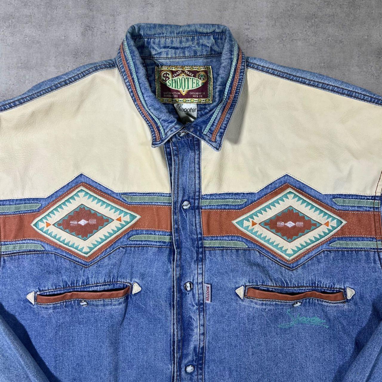 Vintage Shooter Cowboy Western Embroidered Aztec Blue Denim Popper Long Sleeve Shirt