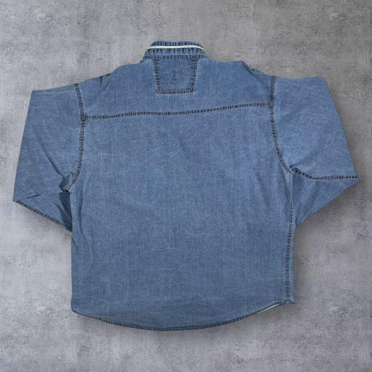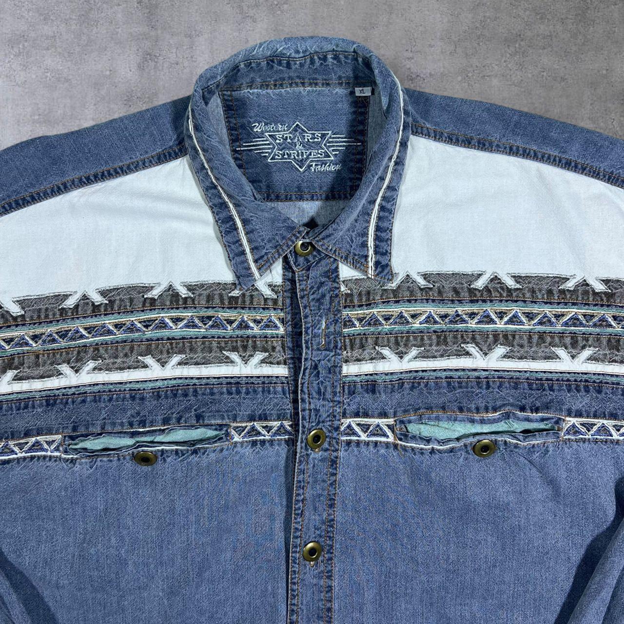 Vintage Stars & Stripes Cowboy Western Patterned Embroidered Blue Denim Long Sleeve Shirt