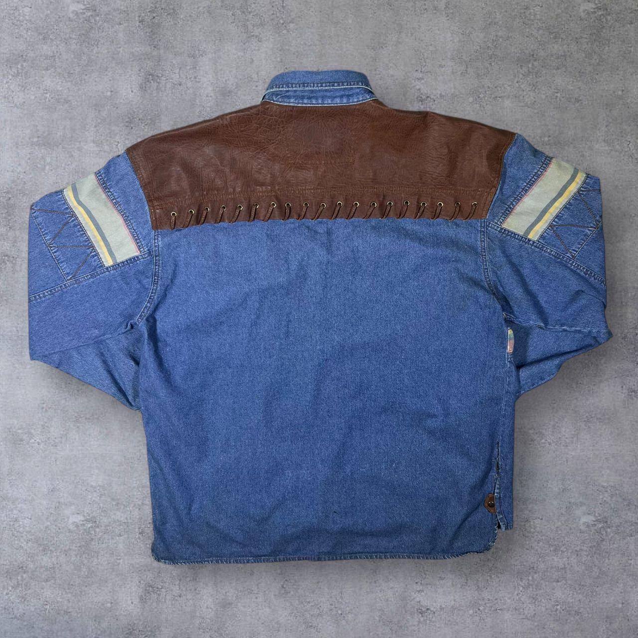 Vintage Stockerpoint Cowboy Western Leather Panel Popper Blue Denim Long Sleeve Shirt