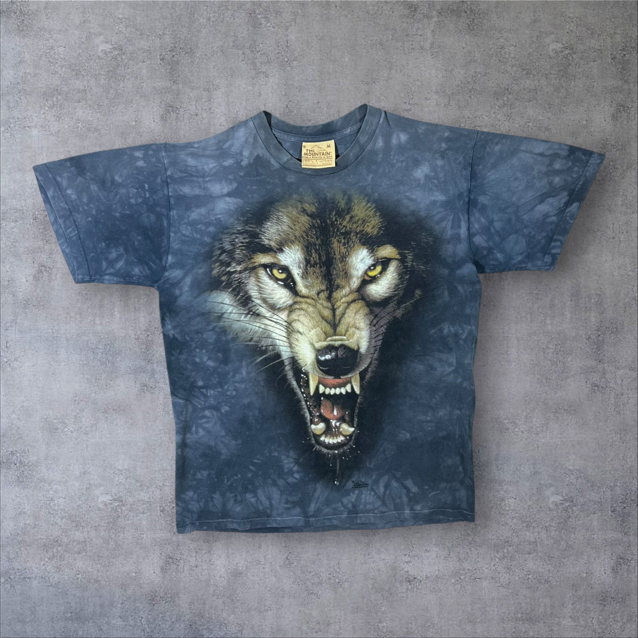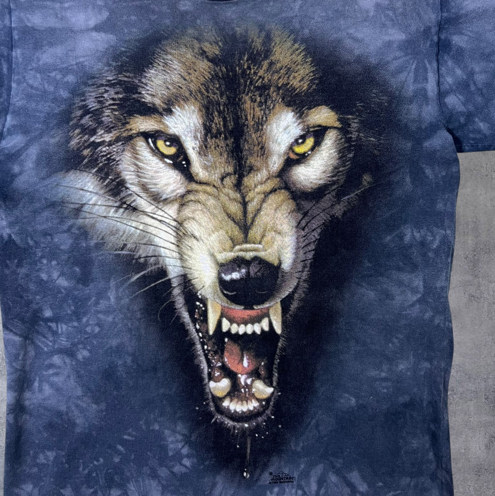 Vintage The Mountain (1999) Wolf Animal Wildlife Graphic Grey-Blue Tie Dye Cotton T-Shirt