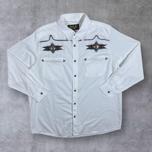 Early 00's Atlas For Men Cowboy Western Embroidered Native White Long Sleeve Cotton Shirt