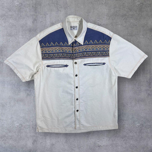 Vintage John Baner Cowboy Western Aztec Patterned Cream Blue Short Sleeve Shirt