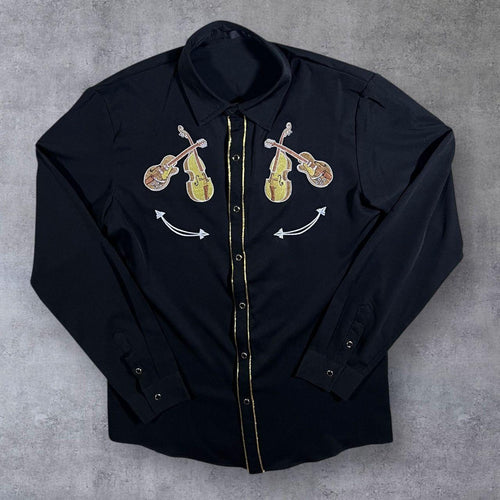 Cowboy Western Embroidered Guitar Black Polyester Spandex Long Sleeve Shirt