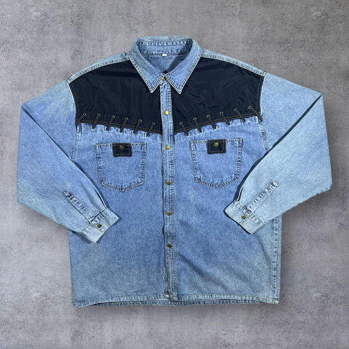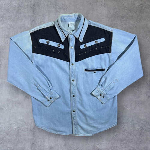 Vintage Cowboy Western Acid Wash Blue Denim Popper Long Sleeve Shirt