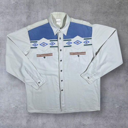 Vintage John Baner Cowboy Western Beige Blue Denim Embroidered Aztec Long Sleeve Shirt