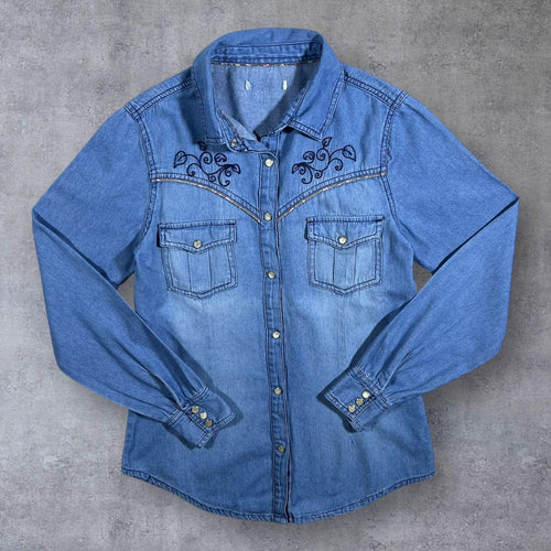 Early 00's Cowboy Western Style Embroidered Floral Popper Blue Denim Long Sleeve Shirt