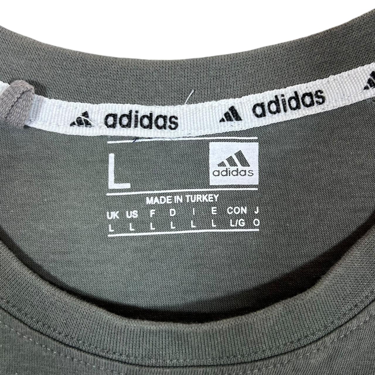 ADIDAS Three Stripe Classic Mini Logo Grey Khaki Short Sleeve T-ShirtSize: Large but fits Small (See measurements)Colour: Grey-KhakiDetail: Rubber logo to chestCondition: Light general wear as expectedMeasurements: Pit to Pit: 18”Length: 28"Shoulder to Cuff: 7”#11376