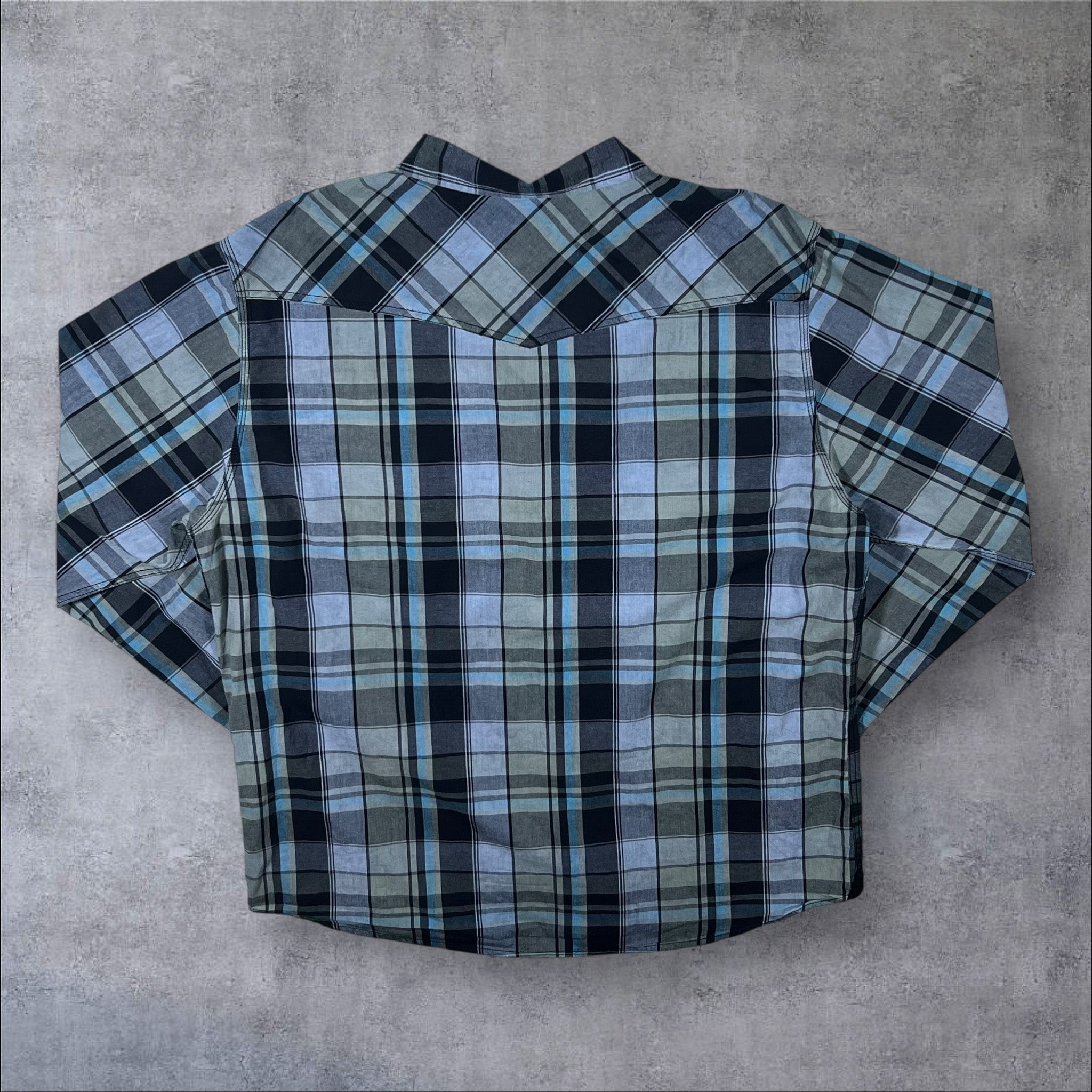 Warehouse One Grey Blue Black Check Cowboy Western Popper Long Sleeve Shirt