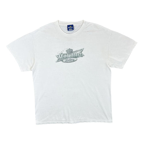 Early 00's CORONA EXTRA Beer Logo Spellout Hawaiian Graphic Distressed White T-Shirt