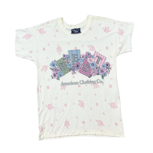 Vintage 90's BEST AMERICAN CLOTHING CO. Floral All-Over Print Spellout Graphic Cropped Sleeve T-Shirt