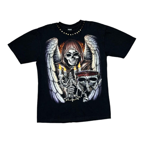 Early 00's THANABAT Gothic Horror Fantasy Angel Of Death Skull Metal Stud Graphic T-Shirt