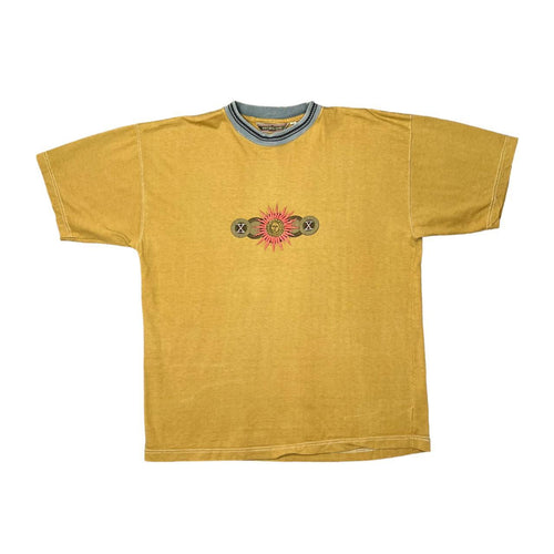 Vintage 90's MCBLUE Embroidered Sun Motif Striped Trim Short Sleeve T-Shirt