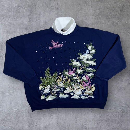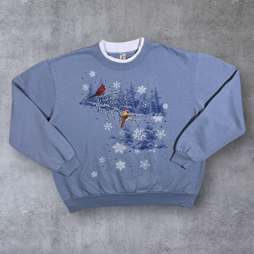 Vintage Decorated Originals Bird Snow Nature Wildlife Graphic Blue Sweatshirt