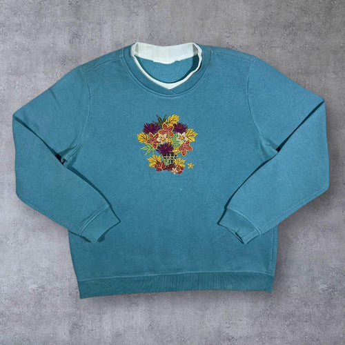 Vintage Embroidered Floral Cottage Core Blue Double Collared Sweatshirt