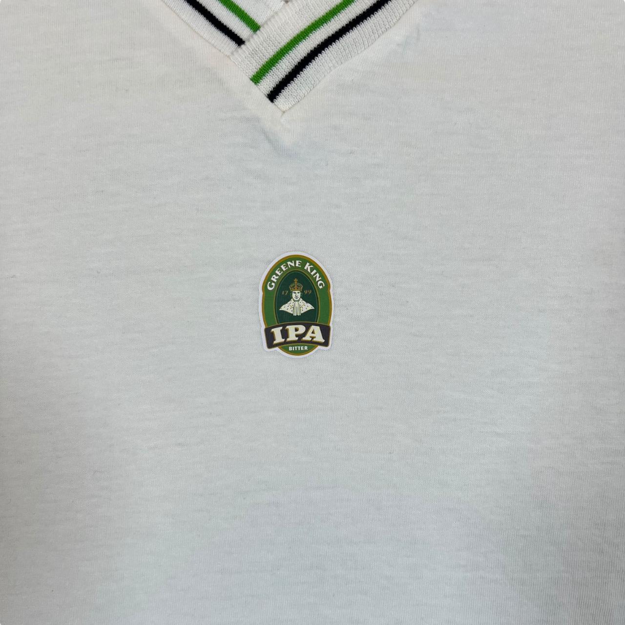 GREENE KING IPA BITTER Classic Beer Logo V-Neck White T-ShirtSize: No size but fits XL (See measurements)Colour: WhiteDetail: Graphic logo print to frontCondition: Light general wear as expectedMeasurements: Pit to Pit: 23”Length: 30.5”Shoulder to Cuff: 10”#10283
