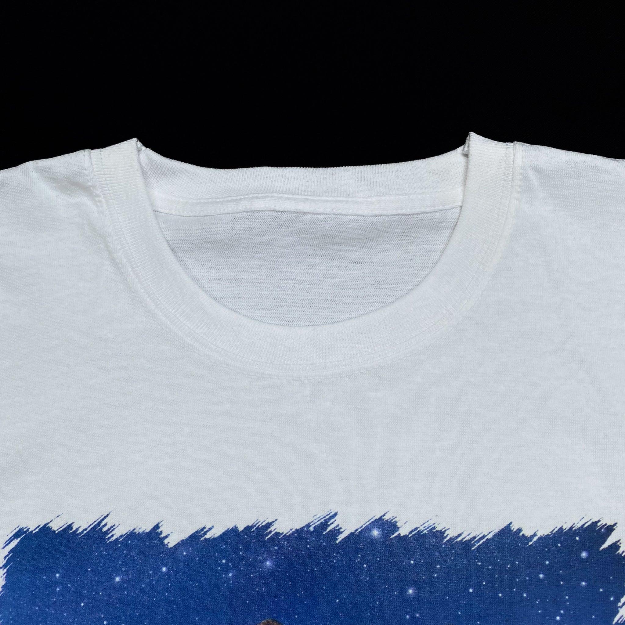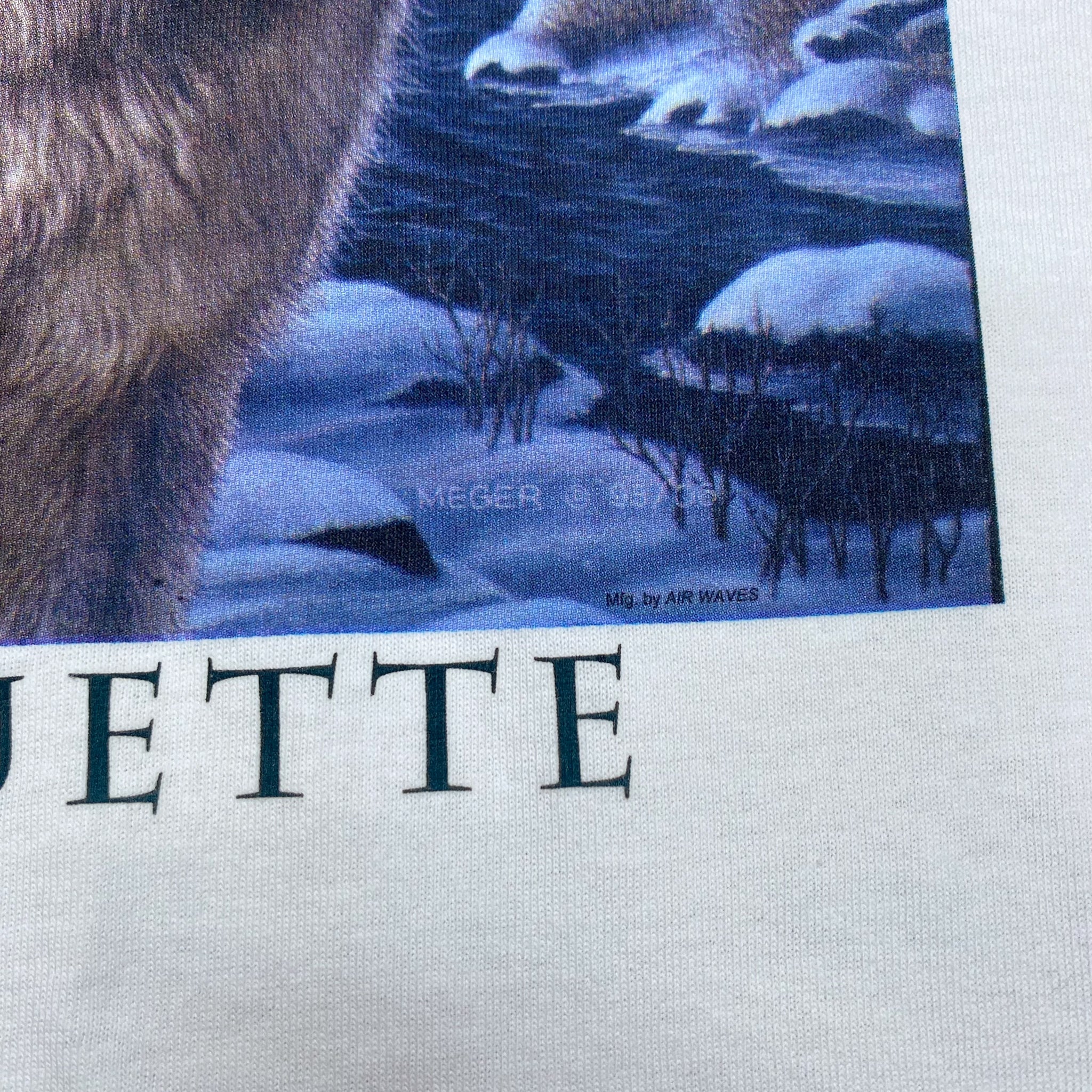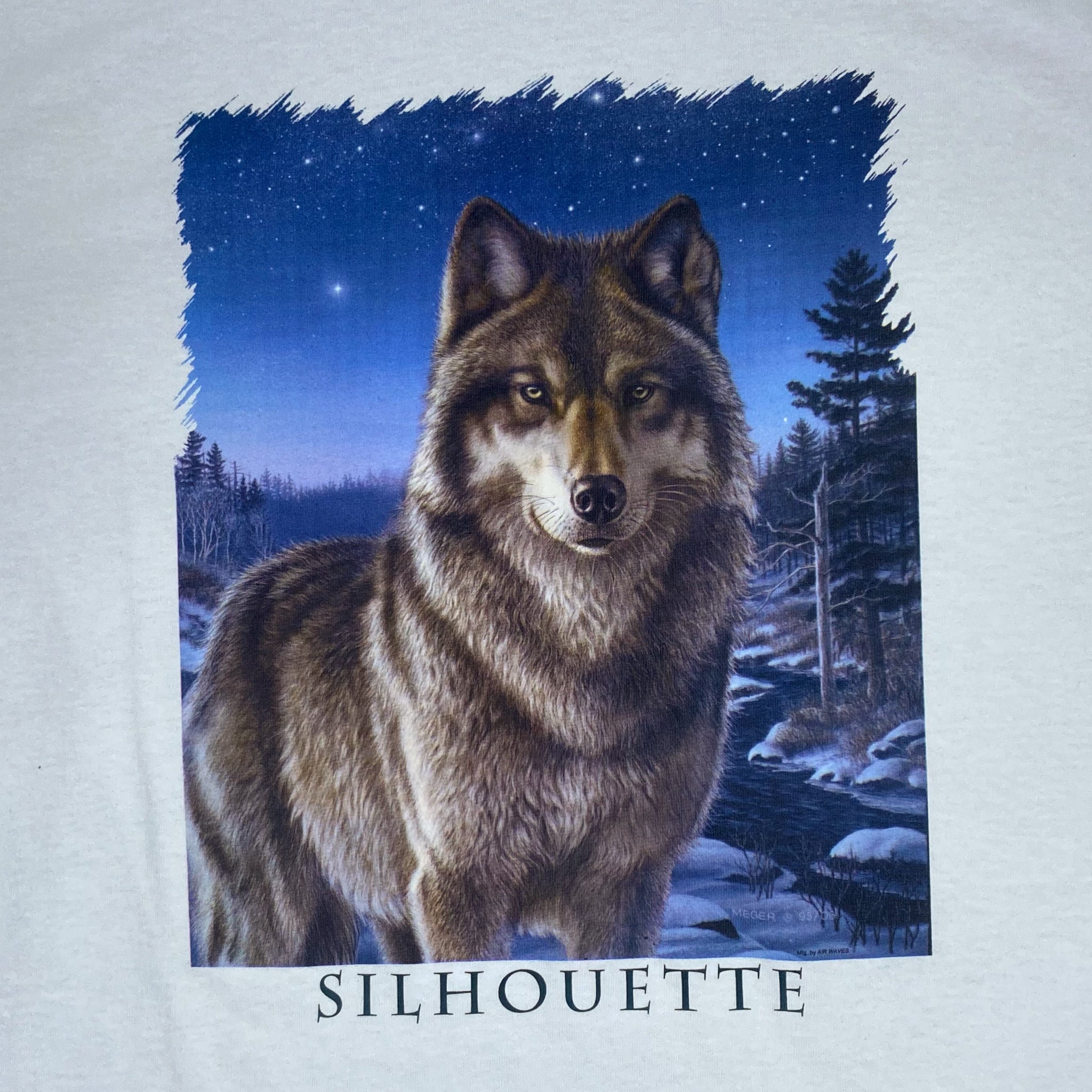 Size: No label but fits XL (See measurements) Colour: White Detail: Wolf wildlife spellout graphic print to front. Original vintage transfer printed on to a blank t-shirt. Condition: Light general wear as expected