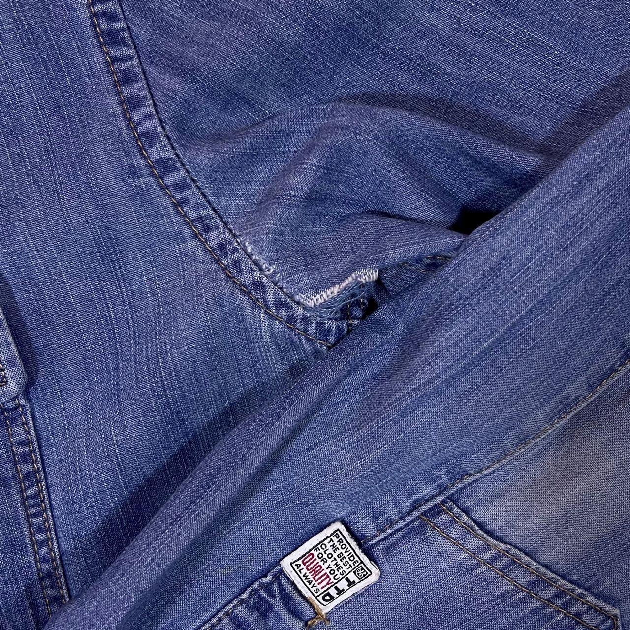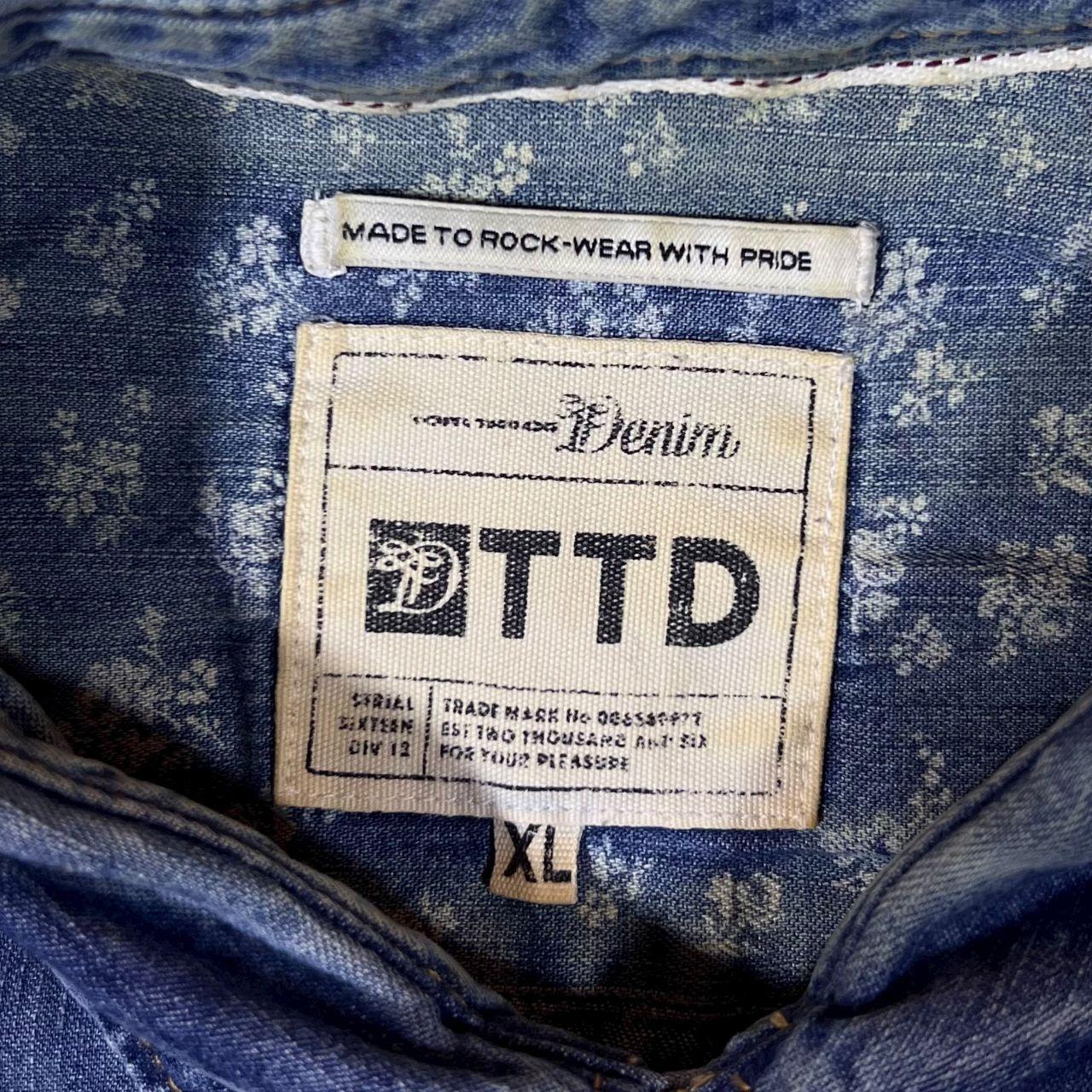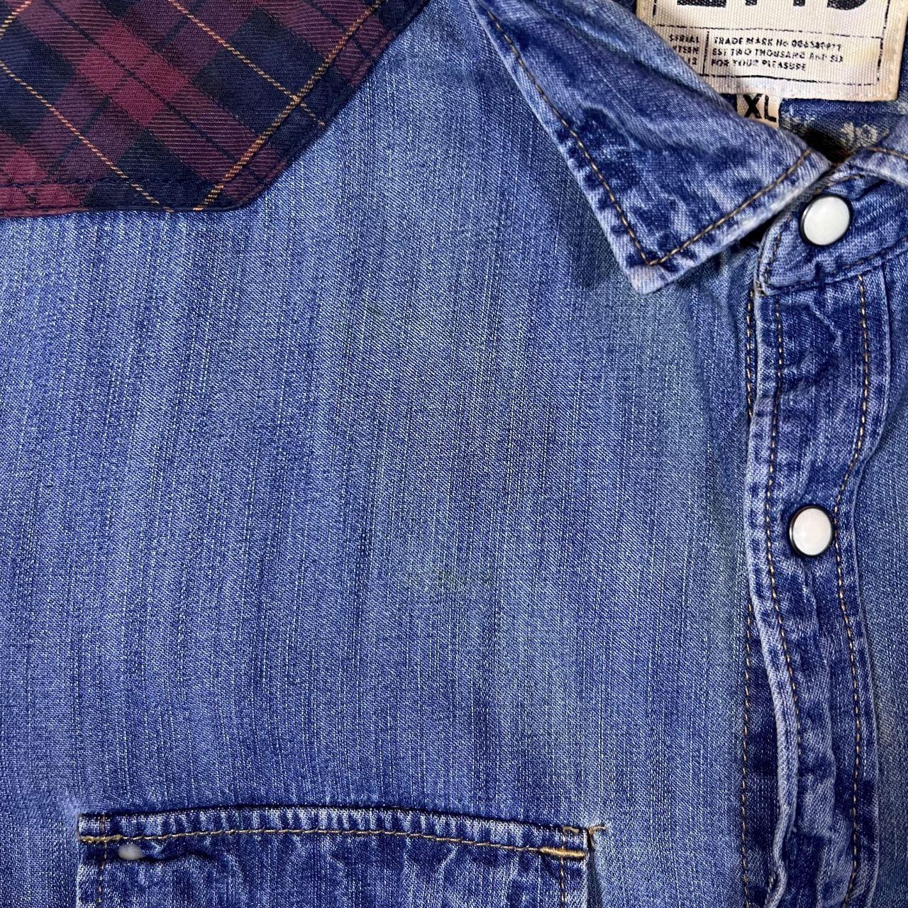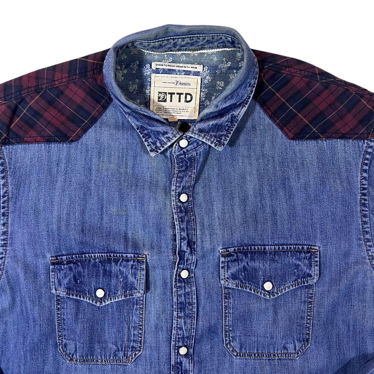 TTD Western Style Plaid Check Panel Blue Denim Popper Long Sleeve Shirt
