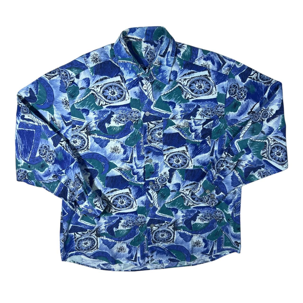 Vintage 90's Blue Green Crazy Abstract Patterned Long Sleeve Shirt