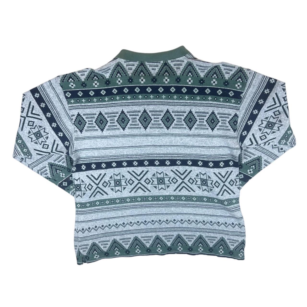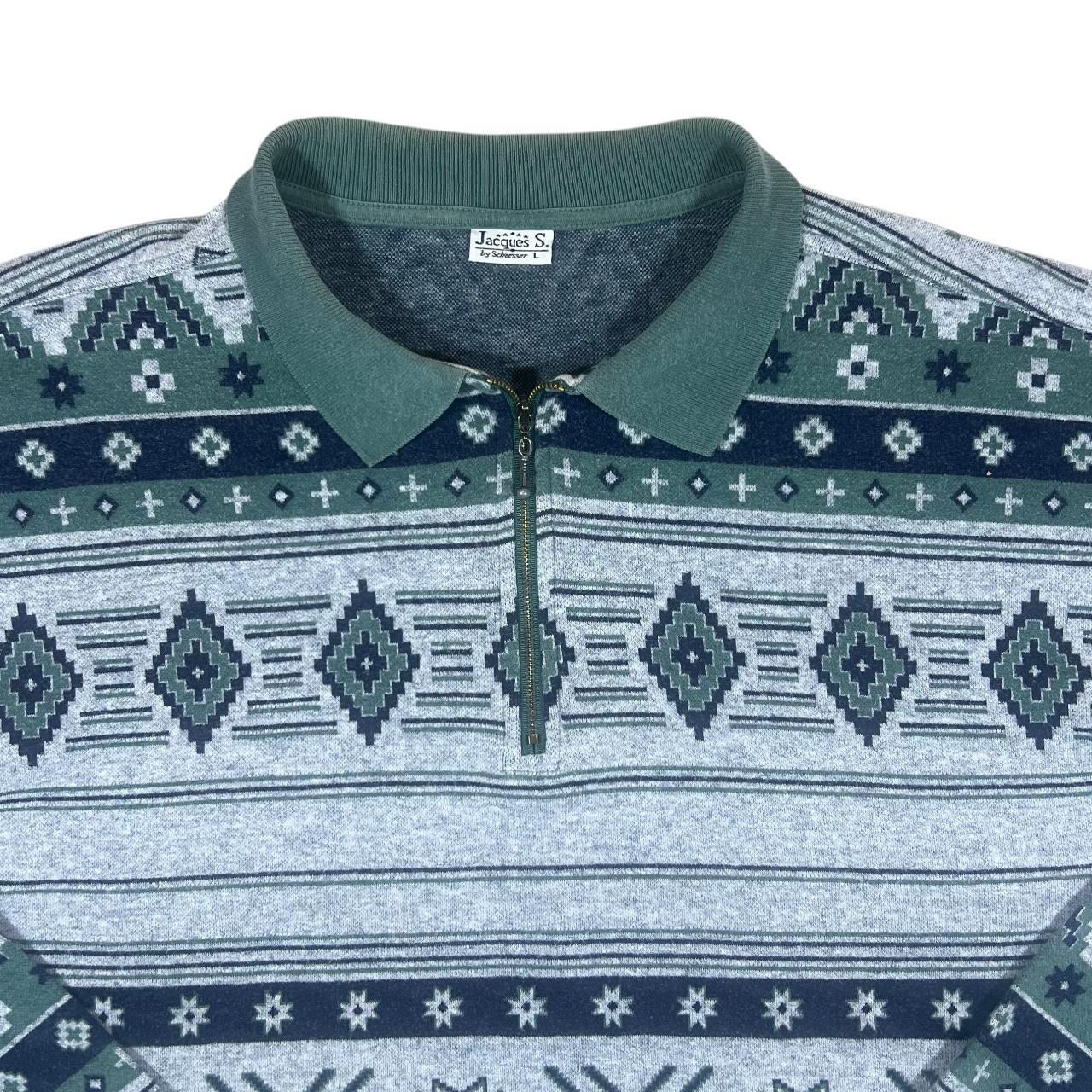 Vintage 90's JACQUES By Schiesser Aztec Patterned 1/4 Zip Long Sleeve Polo ShirtSize: Large would fit XL (See measurements)Colour: Grey/Green/Navy BlueDetail: Zip neck fasteningCondition: Light general wear as expectedMeasurements: Pit to Pit: 23"Length: 28.5"Shoulder to Cuff: 22"#OG1