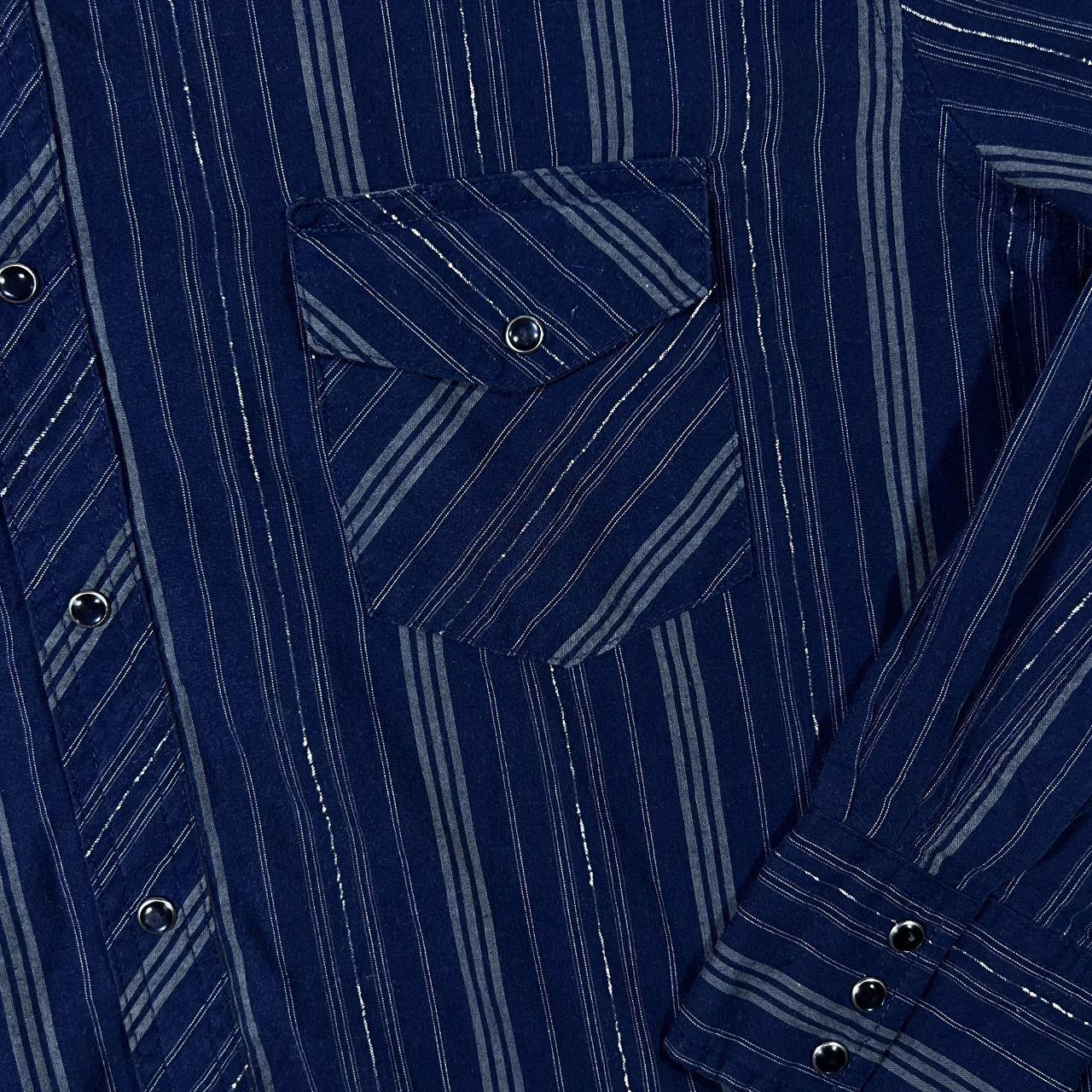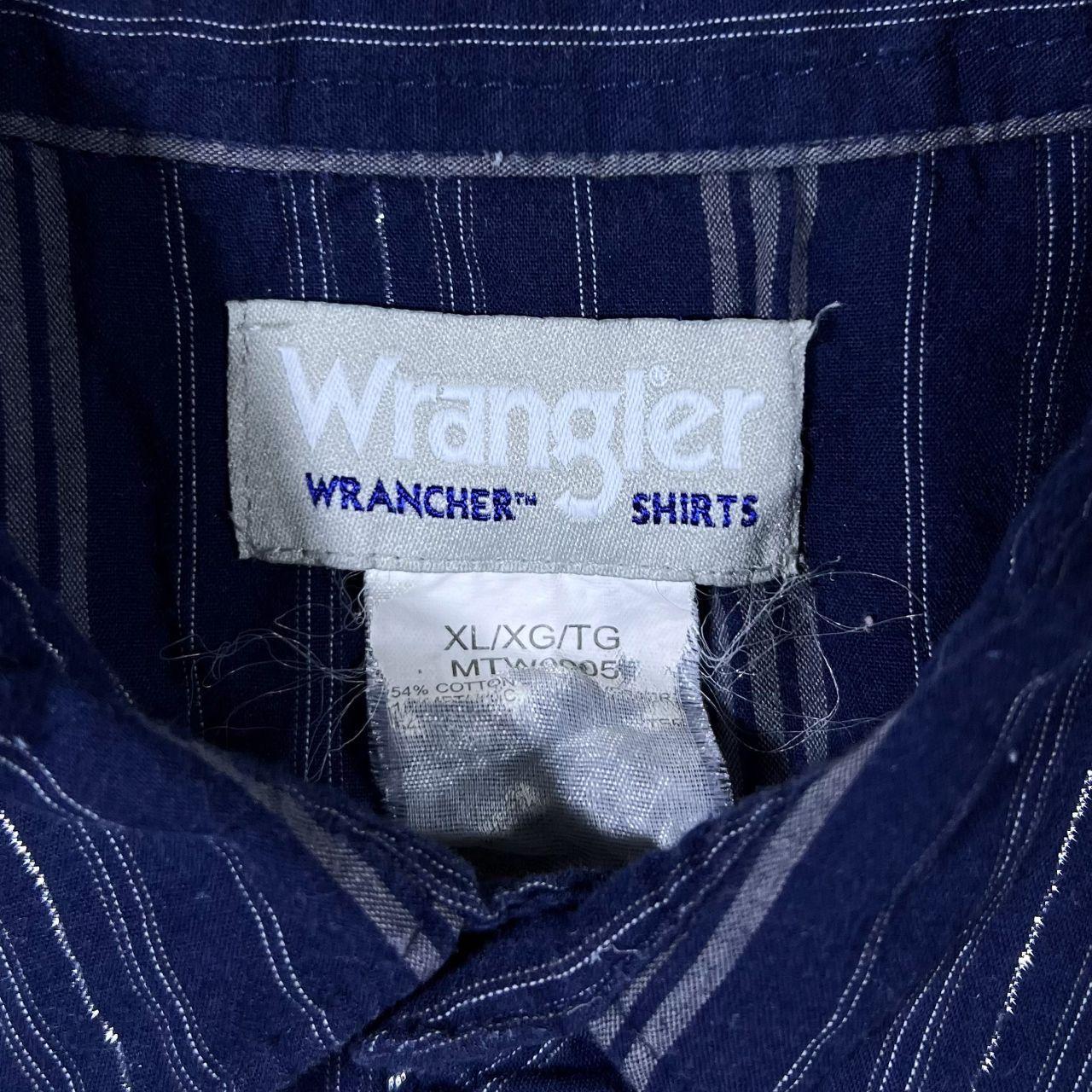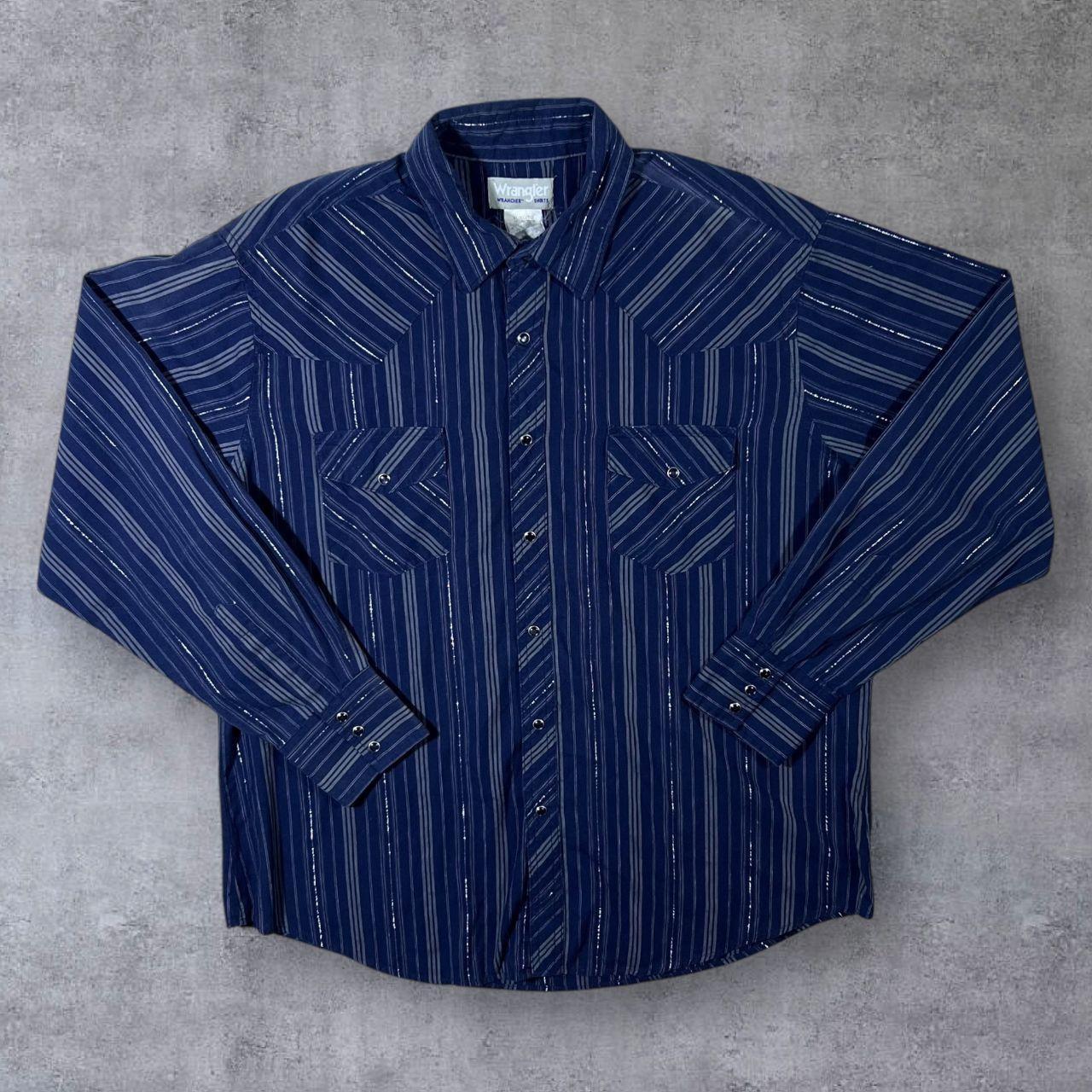 Vintage Wrangler "Wrancher" Navy Blue Striped Check Cowboy Western Popper Long Sleeve Shirt