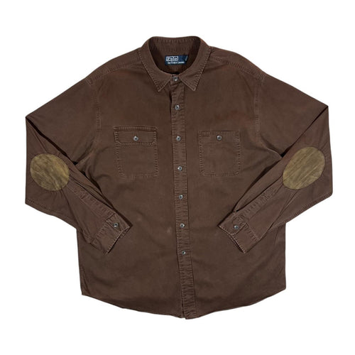 Early 00's POLO RALPH LAUREN Brown Suede Leather Elbow Patch Long Sleeve Cotton Shirt